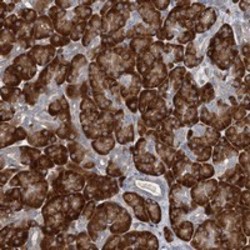- Immunohistochemical staining of human pancreas with C12orf42 polyclonal antibody (Cat # PAB23457) shows strong cytoplasmic positivity in exocrine pancreas at 1:200-1:500 dilution.