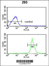 - ATP11C Antibody (Center) (Cat. #AP5446c) flow cytometric analysis of 293 cells (bottom histogram) compared to a negative control cell (top histogram).FITC-conjugated goat-anti-rabbit secondary antibodies were used for the analysis.