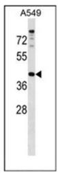 - Western blot analysis of PAQR7 Antibody (C-term) -?in A549 cell line lysates (35ug/lane). This demonstrates the PAQR7 antibody detected the PAQR7 protein (arrow).