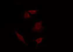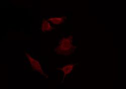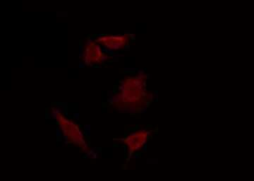 - Immunofluorescent analysis of mPR alpha in 293 cells. Samples were fixed with paraformaldehyde, permeabilized with 0.1% Triton X-100, blocked with 10% serum (45 min at 25°C) incubated with mPR alpha polyclonal antibody (Product # PA5-102102) using a dilution of 1:200 (1 hr, 37°C), and followed by goat anti-rabbit IgG Alexa Fluor 594 at a dilution of 1:600.