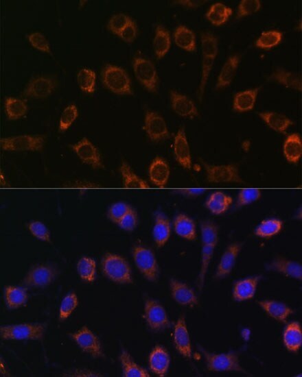 - Immunofluorescence analysis of TCIRG1 in L929 cells. Samples were incubated with TCIRG1 Polyclonal antibody (Product # PA5-90425) using a dilution of 1:100 (40x lens). Blue: DAPI for nuclear staining.