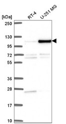 - Western Blot: NOC3L Antibody [NBP2-55900] - Analysis in human cell line RT-4 and human cell line U-251 MG.