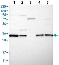 - Western blot analysis of Lane 1: RT-4, Lane 2: U-251 MG, Lane 3: Human Plasma, Lane 4: Liver, Lane 5: Tonsil with GSG1L polyclonal antibody (Cat # PAB20730) at 1:250-1:500 dilution.