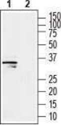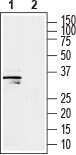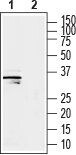 - Western blot analysis of human SH-SY5Y neuroblastoma cell line lysate: - 1. Anti-GSG1L Antibody (#AGC-048), (1:200). 2. Anti-GSG1L Antibody , preincubated with GSG1L Blocking Peptide (#BLP-GC048).