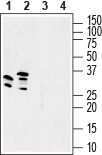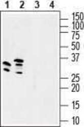 - Western blot analysis of mouse brain lysate (lanes 1 and 3) and rat brain membranes (lanes 2 and 4): - 1, 2. Anti-GSG1L Antibody (#AGC-048), (1:200). 3, 4. Anti-GSG1L Antibody , preincubated with GSG1L Blocking Peptide (#BLP-GC048).