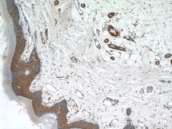 - Immunohistochemistry of paraffin-embedded human skin using 15344-1-AP (MAD2L1BP antibody) at dilution of 1:50 (under 10x lens).