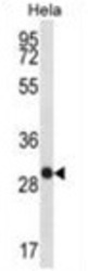 - WFDC1 Antibody (C-term H163) western blot analysis in Hela cell line lysates (35 ug/lane). This demonstrates the WFDC1 antibody detected the WFDC1 protein (arrow).