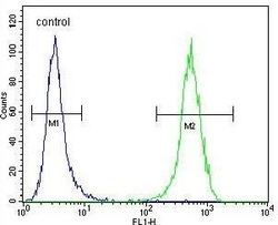 - Flow cytometry testing of human HeLa cells with WFDC1 antibody; Blue=isotype control, Green= WFDC1 antibody.