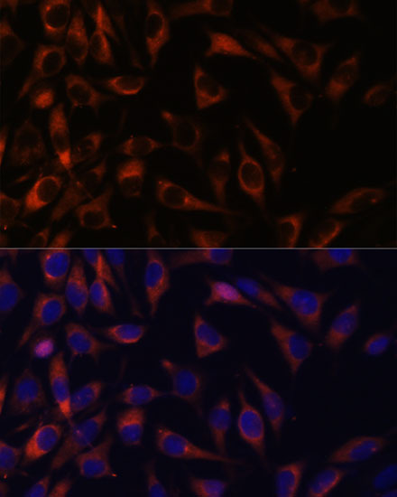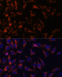 - Immunofluorescence analysis of L929 cells using WFDC1 antibody (STJ11102875) at dilution of 1:100. Blue: DAPI for nuclear staining.