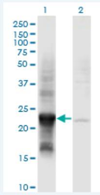 - Western Blot: COX4NB Antibody (4F4) [H00010328-M01-100ug] - Analysis of COX4NB expression in transfected 293T cell line by COX4NB monoclonal antibody (M01), clone 4F4. Lane 1: COX4NB transfected lysate (Predicted MW: 23.8 KDa). Lane 2: Non-transfected lysate.