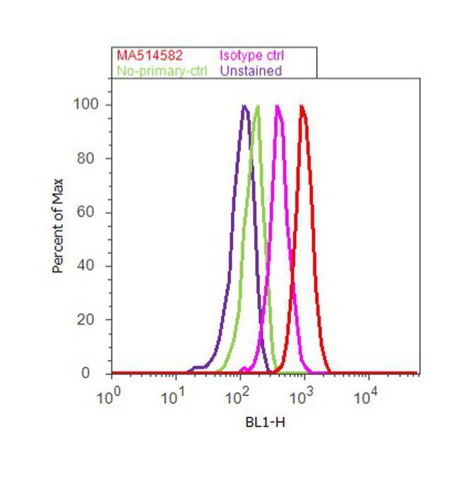 - Flow cytometry analysis of Dog1 was performed using A549 cells. Cells were fixed with 70% ethanol for 10 minutes, permeabilized with 0.25% Triton™ X-100 for 20 minutes, and blocked with 5% BSA for 30 minutes at room temperature. Cells were labeled with Dog1 Rabbit Monoclonal Antibody (MA5-14582, red histogram) or with rabbit isotype control (pink histogram) at 3-5 ug/million cells in 2.5% BSA. After incubation at room temperature for 2 hours, the cells were labeled with Alexa Fluor® 488 Goat Anti-Rabbit Secondary Antibody (A11008) at a dilution of 1:400 for 30 minutes at room temperature. The representative 10,000 cells were acquired and analyzed for each sample using an Attune® Acoustic Focusing Cytometer. The purple histogram represents unstained control cells and the green histogram represents no-primary-antibody control..