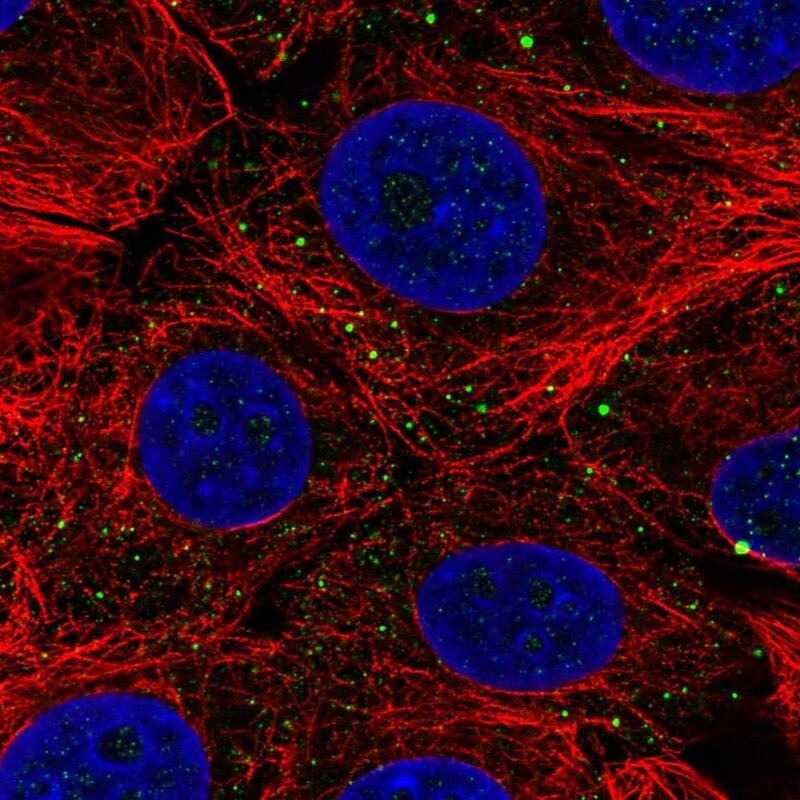- Immunofluorescent staining of human cell line MCF7 shows localization to vesicles.