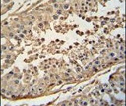 - Immunohistochemistry analysis in formalin-fixed, paraffin-embedded human testis tissue using a FBXO24 polyclonal antibody (Product # PA5-24487), followed by HRP-conjugated secondary antibody and DAB staining.