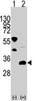 - Western blot analysis of FRAT1 (arrow) using rabbit FRAT1 polyclonal antibody (Cat # PAB3083). 293 cell lysates (2 ug/lane) either nontransfected (Lane 1) or transiently transfected with the FRAT1 gene (Lane 2) (Origene Technologies).