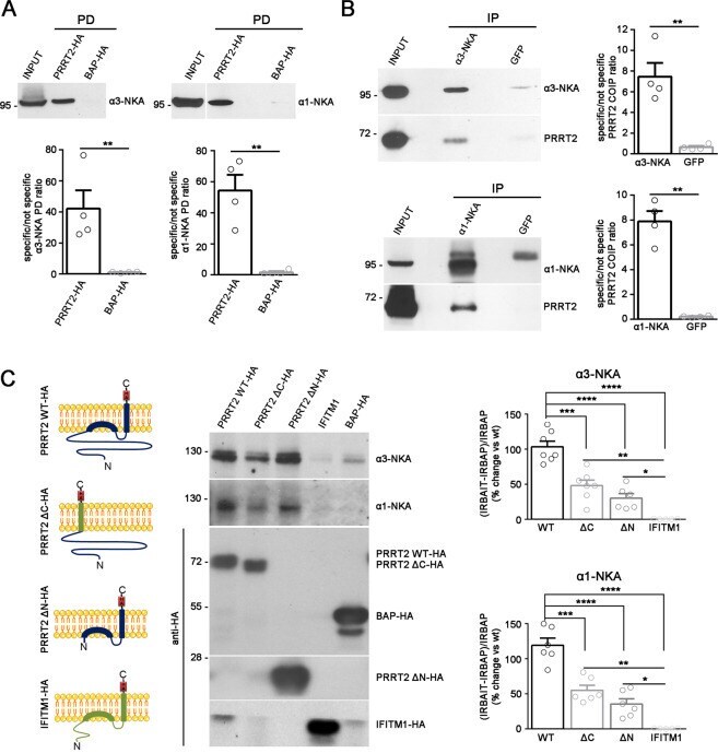 - Fig. 1 PRRT2 interacts with alpha3-NKA and alpha1-NKA subunits. A Pulldown of alpha3-NKA and alpha1-NKA by PRRT2 : Affinity-purified PRRT2-HA or BAP-HA were incubated with total mouse brain extracts. After pulldown (PD), pellets were solubilized and subjected to western blotting with alpha3-NKA and alpha1-NKA antibodies. Mouse brain lysates incubated with PRRT2-HA showed specific immunoreactivity for alpha3-NKA and alpha1-NKA in the precipitates, which were not detected with BAP-HA. Top: Representative immunoblots are shown. Bottom: Quantification of the alpha3-NKA and alpha1-NKA immunoreactivities in the pulled down samples normalized to the BAP-HA control (means +- SEM, n = 4 independent experiments, ** p < 0.01; unpaired Student's t -test). Input, 10 mug total extract. B Co-immunoprecipitation of PRRT2 with alpha3-NKA and alpha1-NKA antibodies : Detergent extracts of mouse brain were immunoprecipitated (IP) with monoclonal antibodies (mAbs) to alpha3-NKA, alpha1-NKA or GFP (used as a control), as indicated. After the electrophoretic separation of the immunocomplexes and western blotting, membranes were probed with alpha3-NKA or alpha1-NKA antibodies to test the immunoprecipitation efficiency, as well as with polyclonal PRRT2 antibodies to test for co-immunoprecipitation. Left: Representative immunoblots are shown. Right: Quantification of the PRRT2 immunoreactive signal in the immunoprecipitated samples normalized to the GFP nonspecific signal (means +- SEM, n = 4 independ