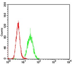 - Flow cytometry of PKHD1 in HeLa cells (green). Sample was incubated with PKHD1 monoclonal antibody (Product # MA5-31848) using a dilution of 1:200-1:400 followed by negative control (red).