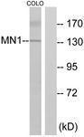 - Western blot analysis of extracts from COLO cells, using MN1 Antibody. The lane on the right is treated with the synthesized peptide.