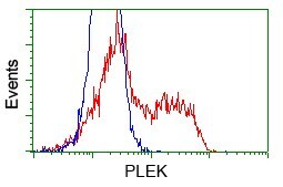- HEK293T cells transfected with either pCMV6-ENTRY PLEK(RC203780)(Red) or empty vector control plasmid (Blue) were immunostained with anti-PLEK mouse monoclonal(TA500903), and then analyzed by flow cytometry.