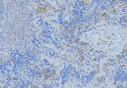 - 1:100 staining human lymph node tissue by IHC-P. The sample was formaldehyde fixed and a heat mediated antigen retrieval step in citrate buffer was performed. The sample was then blocked and incubated with the antibody for 1.5 hours at 22°C. An HRP conjugated goat anti-rabbit antibody was used as the secondary.
