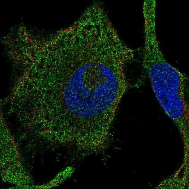 - Immunofluorescent staining of RAB42 in human cell line HeLa shows localization to endoplasmic reticulum. Samples were probed using a RAB42 Polyclonal Antibody (Product # PA5-65606).