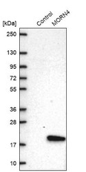 - Western Blot: MORN4 Antibody [NBP2-30713] - Analysis in control (vector only transfected HEK293T lysate) and MORN4 over-expression lysate (Co-expressed with a C-terminal myc-DDK tag (3.1 kDa) in mammalian HEK293T cells).