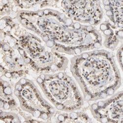 - Immunohistochemical staining of human small intestine shows moderate nuclear positivity in glandular cells.