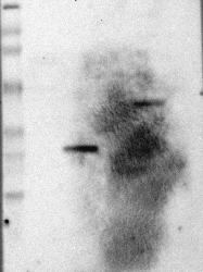 - Band of predicted size in kDa (+/-20%) with additional bands present.