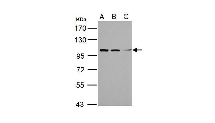 - Sample (30 ug of whole cell lysate) A: A431 B: HeLa C: HepG2 7.5% SDS PAGE OAGA00475 diluted at 1:1000