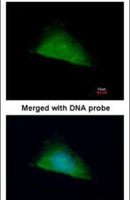 - Immunofluorescent analysis of TRIM37 in paraformaldehyde-fixed HeLa cells using a TRIM37 polyclonal antibody (Product # PA5-21737) at a 1:200 dilution.