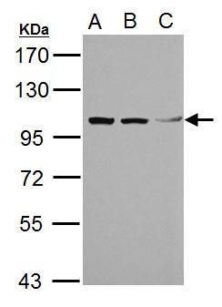 - Western blot analysis of TRIM37 using 30 µg of A) A431 (B) HeLa and C) HepG2 lysate. Samples were loaded onto a 7.5% SDS-PAGE gel and probed with a TRIM37 polyclonal antibody (Product # PA5-21737) at a dilution of 1:1000.