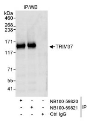 - Immunoprecipitation: TRIM37 Antibody [NB100-59820] - Detection of Human TRIM37 on HeLa whole cell lysate using NB100-59820. TRIM37 was also immunoprecipitated by rabbit anti-TRIM37 antibody NB100-59821. For blotting immunoprecipitated TRIM37 NB100-59821 was used at 1.0 ug/ml.