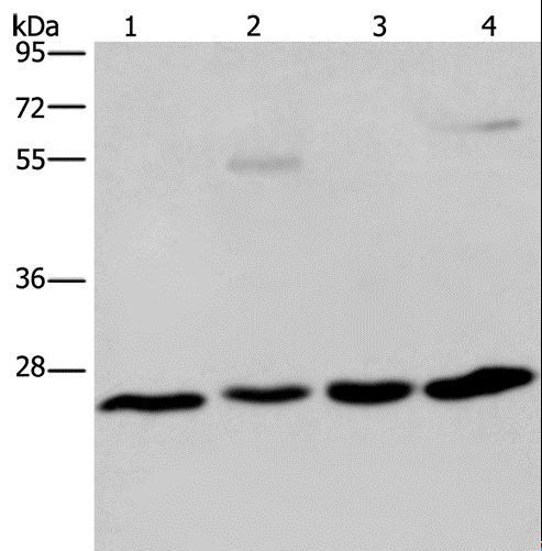 - Western blot analysis of A549 cell and human hepatocellular carcinoma, mouse liver tissue and HT-29 cell, using ETHE1 Polyclonal Antibody at dilution of 1:400.