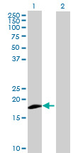 - Western Blot analysis of ZNF576 expression in transfected 293T cell line (H00079177-T01) by ZNF576 MaxPab polyclonal antibody.Lane 1: ZNF576 transfected lysate(18.7 KDa).Lane 2: Non-transfected lysate.