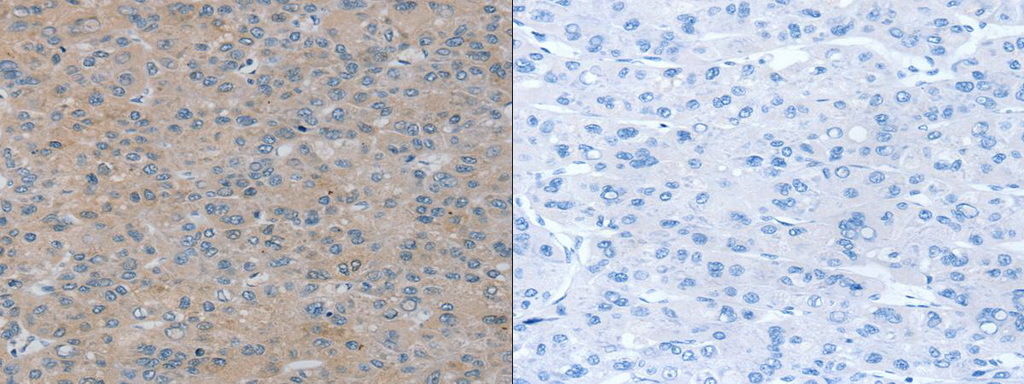 - The image on the left is immunohistochemistry of paraffin-embedded Human liver cancer tissue using (RASA4 Antibody) at dilution 1/20, on the right is treated with fusion protein. (Original magnification: ?200)