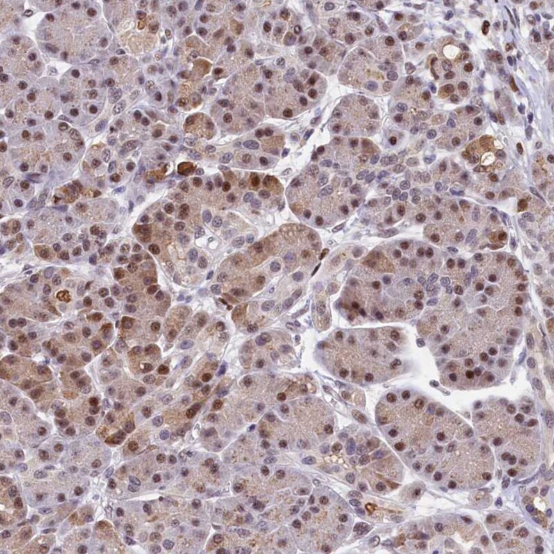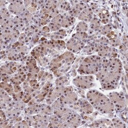 - Immunohistochemical analysis of HECTD4 in human pancreas using HECTD4 Polyclonal Antibody (Product # PA5-59413) shows moderate nuclear and cytoplasmic positivity in exocrine glandular cells.