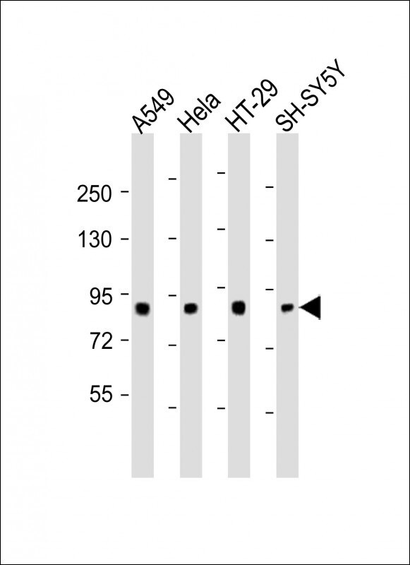 - Western Blot analysis of SEMA4G using the SEMA4G Polyclonal Antibody (Product # PA5-116361) at a 1:2000 dilution. Lane 1: A549 whole cell lysates, Lane 2: Hela whole cell lysates, Lane 3: HT-29 whole cell lysates, Lane 4: SH-SY5Y whole cell lysates. Lysates/proteins at 20 µg per lane. Secondary Goat Anti-Rabbit IgG, (H+L), Peroxidase conjugated at 1:10,000 dilution Predicted band size : 91 kDa. Blocking/Dilution buffer: 5% NFDM/TBST.
