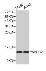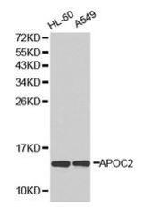 - Western blot analysis of extracts of various cell lines, using APOC2 antibody.