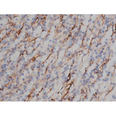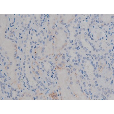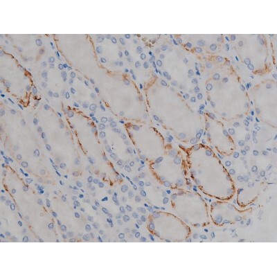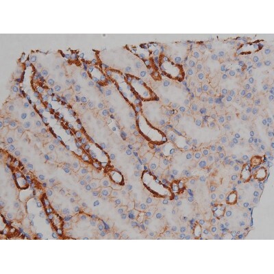 - 1:200 staining human kidney tissue by IHC-P. The tissue was formaldehyde fixed and a heat mediated antigen retrieval step in citrate buffer was performed. The tissue was then blocked and incubated with the antibody for 1.5 hours at 22°C. An HRP conjugated goat anti-rabbit antibody was used as the secondary.