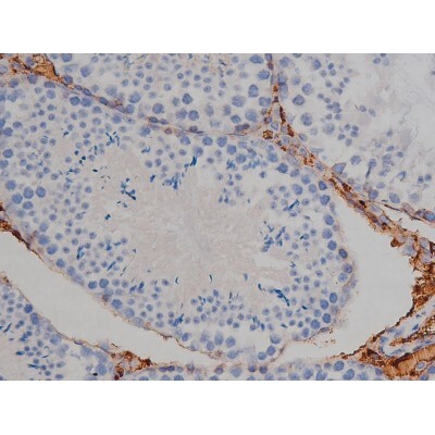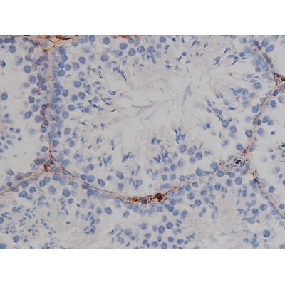 - 1:200 staining mouse testis tissue by IHC-P. The tissue was formaldehyde fixed and a heat mediated antigen retrieval step in citrate buffer was performed. The tissue was then blocked and incubated with the antibody for 1.5 hours at 22°C. An HRP conjugated goat anti-rabbit antibody was used as the secondary.