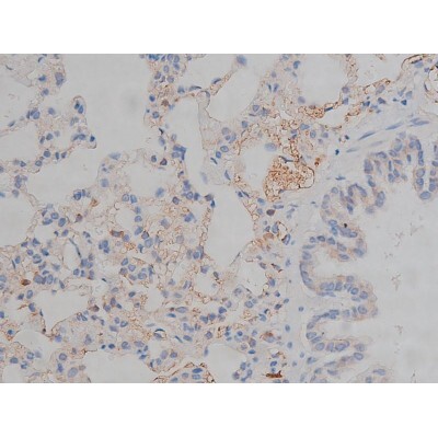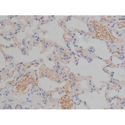 - 1:200 staining rat lung tissue by IHC-P. The tissue was formaldehyde fixed and a heat mediated antigen retrieval step in citrate buffer was performed. The tissue was then blocked and incubated with the antibody for 1.5 hours at 22°C. An HRP conjugated goat anti-rabbit antibody was used as the secondary.