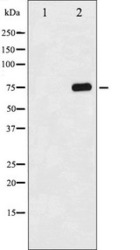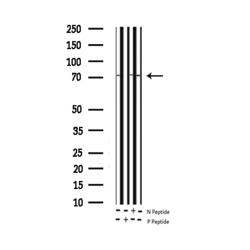 - Western blot analysis of Tau phosphorylation expression in 293 whole cells lysates. The lane on the left is treated with the antigen-specific peptide.