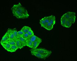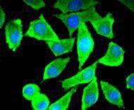 - Immunocytochemistry-Immunofluorescence analysis of of Tau in Hela cells (green). Formalin fixed cells were permeabilized with 0.1% Triton X-100 in TBS for 10 minutes at room temperature and blocked with 1% Blocker BSA for 15 minutes at room temperature. Cells were probed with Tau Recombinant Monoclonal Antibody (Product # MA5-42451) at a dilution of 1:50 for 1 hour at room temperature, washed with PBS. Alexa Fluor 488 Goat anti-Rabbit IgG was used as the secondary antibody at 1:1,000 dilution. The nuclear counter stain is DAPI (blue).