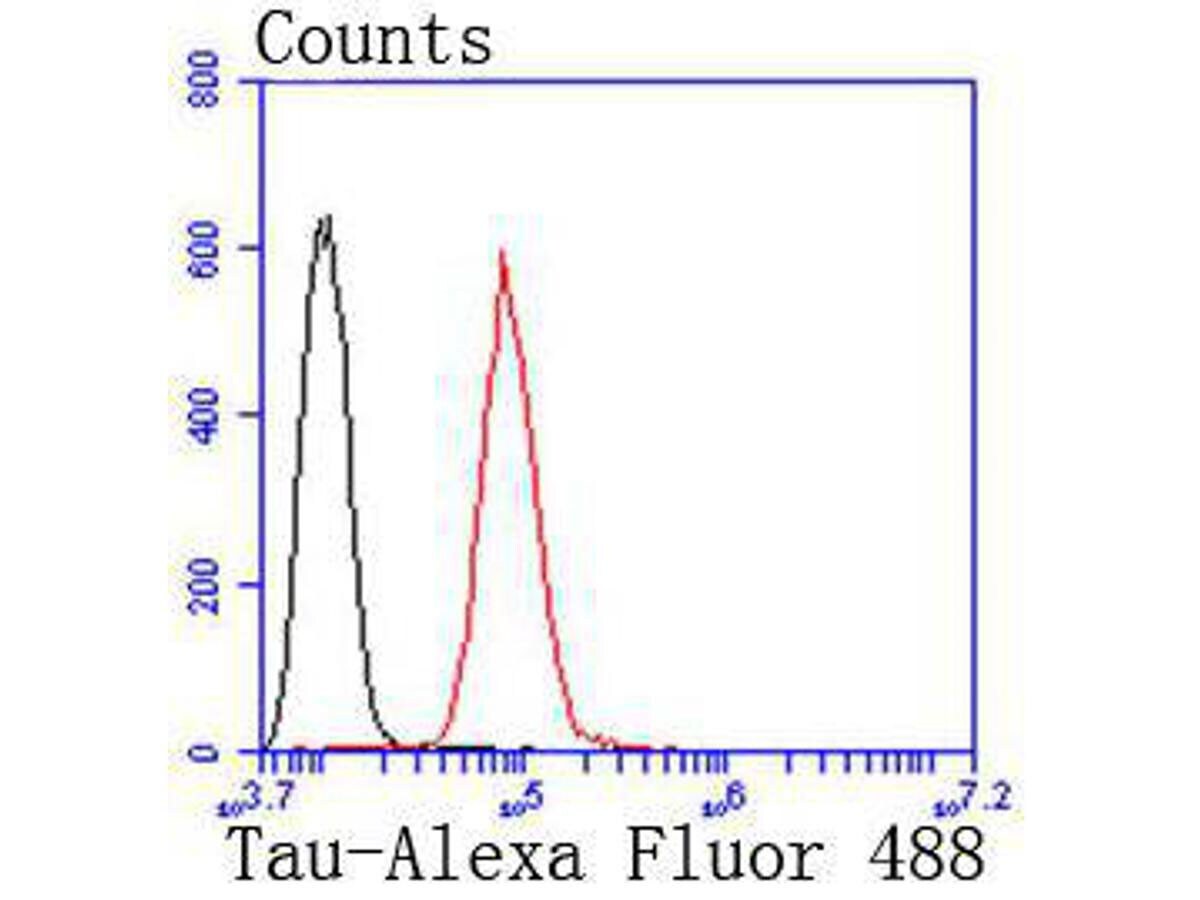 - Flow Cytometry analysis of Tau in SH-SY5Y cells using Tau Recombinant Monoclonal Antibody (Product # MA5-42451) at 1:50 (red). After incubation of the primary antibody at room temperature for an hour, the cells were stained with a Alexa Fluor 488-conjugated Goat anti-Rabbit IgG Secondary antibody at 1:1,000 dilution for 30 minutes. Unlabelled sample was used as a control (cells without incubation with primary antibody; black).