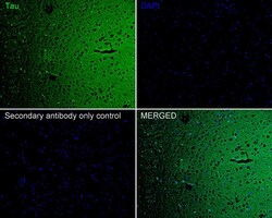 - Immunohistochemistry analysis of Tau with paraffin-embedded mouse brain. The tissues were blocked in 1% BSA (20 min, room temp) washed with ddH2O and PBS, incubated with recombinant monoclonal Tau (Product # MA5-42451) at a dilution of 1:200 (1 hr, room temperature). Detection was performed with HRP, DAB was used as the chromogen, counterstained with hematoxylin and mounted with DPX.