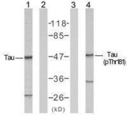 - Western blot analysis of extracts from mouse brain tissue using Tau (Phospho-Thr181) Antibody (GTX50171) and the same antibody preincubated with blocking peptide.