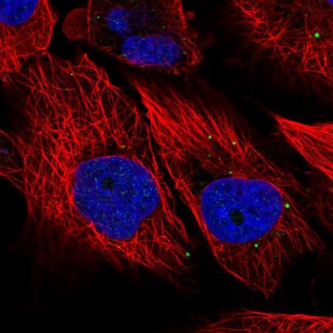 - Immunofluorescent staining of PKN3 in human cell line U-251 MG shows positivity in vesicles. Samples were probed using a PKN3 Polyclonal Antibody (Product # PA5-63553).