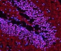 - Immunohistochemical analysis of LHX5 in perfusion fixed frozen sections of adult mouse brain (hippocampus). Samples were incubated in LHX5 polyclonal antibody (Product # PA5-47828) using a dilution of 10 µg/mL overnight at 4 °C followed by NorthernLights™ 557-conjugated Anti-Goat IgG Secondary Antibody (red) and counterstained with DAPI (blue).