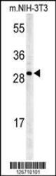 - KCTD21 Antibody (C-term)(Cat. #AP5408b) western blot analysis in mouse NIH-3T3 cell line lysates (35ug/lane).This demonstrates the KCTD21 antibody detected the KCTD21 protein (arrow).