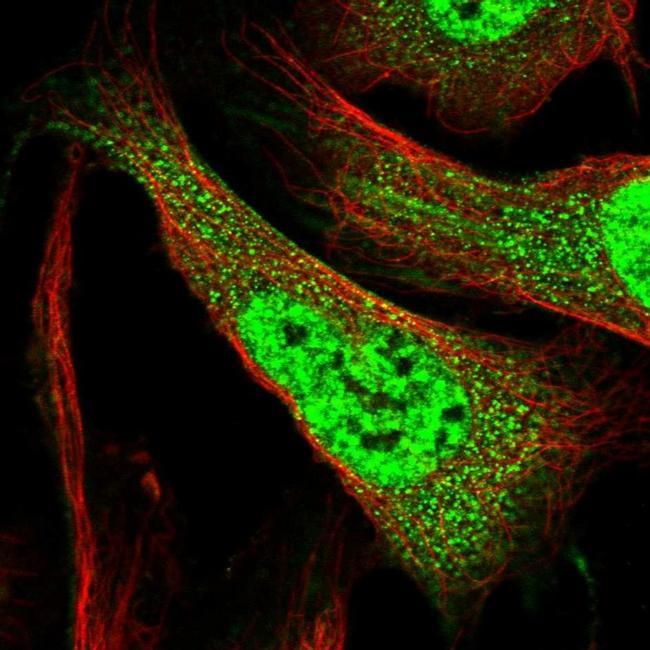 - Immunofluorescent staining of ZBTB8A in human cell line U-2 OS shows positivity in actin filaments & nucleus but excluded from the nucleoli. Samples were probed using a ZBTB8A Polyclonal Antibody (Product # PA5-56850).