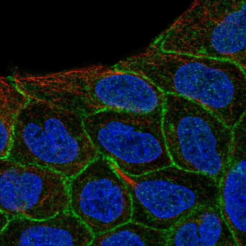 - Immunofluorescent staining of human cell line RT4 shows localization to cell junctions.